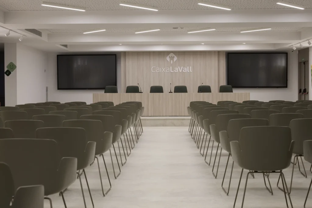 En el salón de conferencias que se encuentra justo al lado de la biblioteca es un espacio multifuncional diseñado para eventos, charlas y presentaciones.